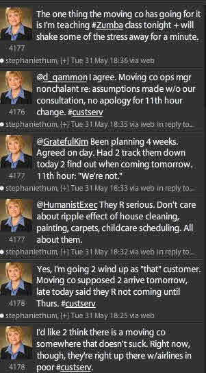 Stephanie Thum is mad. So, mad in fact, that she posted some 10-20 tweets tagged #custserv about her moving company letting her down and delivering terrible customer service. Stephanie is a regular #custserv contributor (let's not hold that against her), who describes herself as Passionate about client feedback.